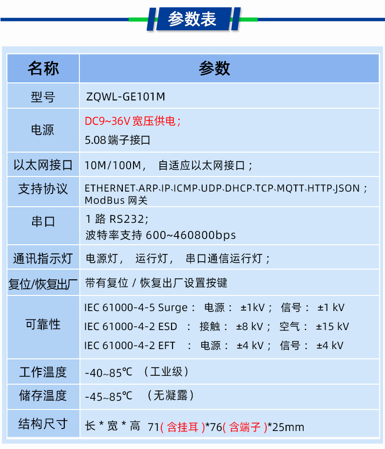 智嵌物联 ZQWL 自主研发的高性价比单串口服务器 ZQWL-GE101M,具有 1 路网口、一路 RS232,内部集成了TCP/IP 协议栈,可实现串口 RS232到以太网口数据的双向透明传输、ModBus 协议转换等功能。设备通过简单的配置,即可轻松实现串口设备的联网、上云等功能。广泛应用于机房监控、智慧农业、环境监控、智能交通、道闸控制、智能快递柜等行业。支持多种通讯协议:MQTT、HTTP、TCP、UDP、JSON、Web Socket、Modbus TCP/RTU 主从等。
