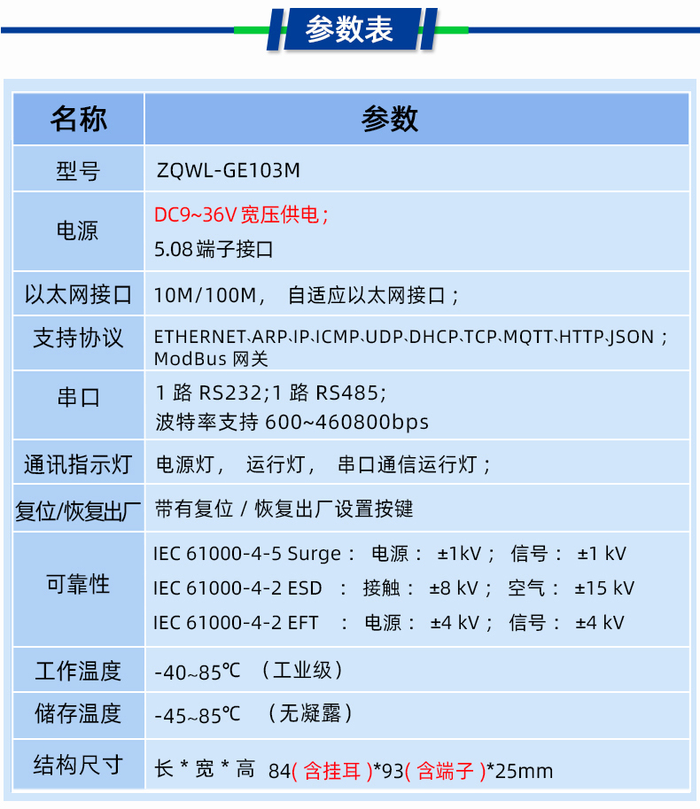 智嵌物联 ZQWL 自主研发的高性价比单串口服务器 ZQWL-GE103M,具有 1 路网口、一路 RS232/RS485,内部集成了 TCP/IP 协议栈,可实现串口到以太网口数据的双向透明传输、ModBus 协议转换等功能。设备通过简单的配置,即可轻松实现串口设备的联网、上云等功能。广泛应用于机房监控、智慧农业、环境监控、智能交通、道闸控制、智能快递柜等行业。支持多种通讯协议:MQTT、HTTP、TCP、UDP、JSON、Web Socket、Modbus TCP/RTU 主从等。