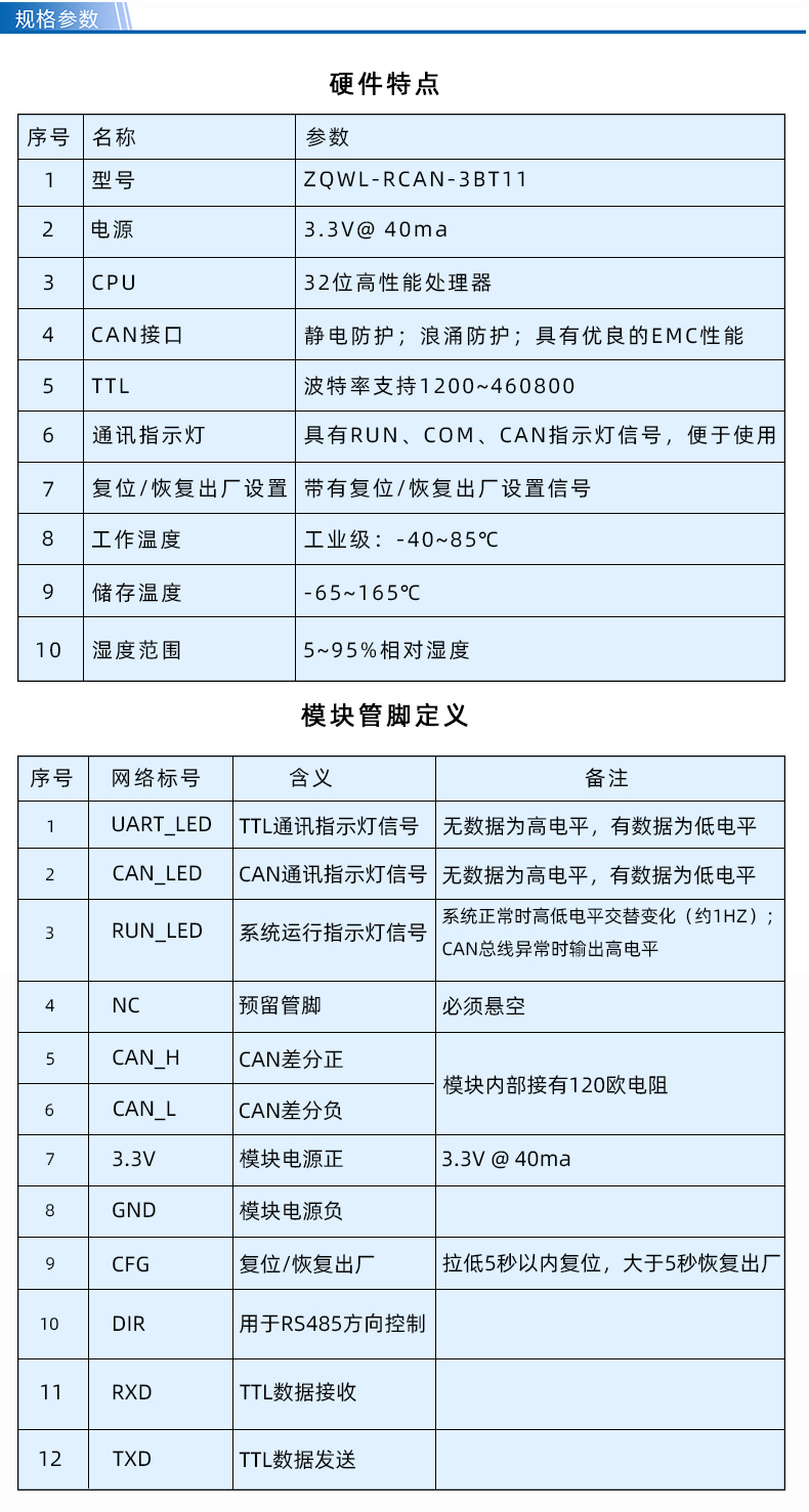 智嵌物联/ZQWL出品的ZQWL-RCAN-3BT11(一下简称 3BT11)是实现串口(TTL)与 CAN 的数据相互转换的设备。设备的 CAN 参数(如波特率等)和串口参数都可以通过配置软件修改。