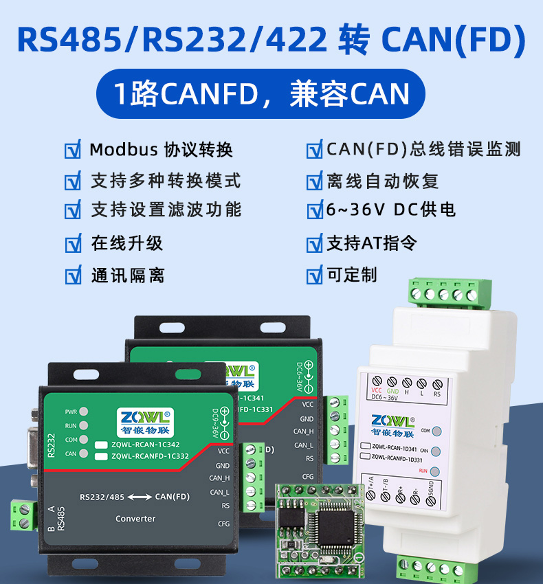 该系列串口转 CAN(FD) 智能协议转换器可以快速将 RS-232/485/422 通讯设备连接到CAN(FD)-BUS 现场总线。 转换器支持串口波特率范围 1200~921600bps,CAN(FD)-bus 波特率范围 5k~5Mbps。 转换器支持五种转换模式:透明转换、透明带标识转换、格式转换、Modbus转换以及带帧头帧尾转换。既可以通过配置软件配置参数,也可以通过 AT 指令配置参数,使用方便。