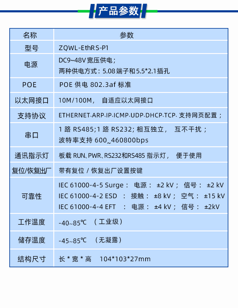智嵌物联自主研发的串口服务器 ZQWL-EthRS-P1,具有 1 路网口、一路 RS485、一路 RS232 接口。支持标准 POE供电(802.3af),一根网线即可兼备数据传输和供电的双重能力。CPU 采用全新 ARM Cortex-M4 内核,内部集成了TCP/IP 协议栈,可实现串口到以太网口数据的双向透明传输、ModBus 协议转换等功能。设备通过简单的配置,即可轻松实现串口设备的联网、上云等功能。广泛应用于机房监控、智慧农业、环境监控、智能交通、道闸制、智能快递柜等行业。
