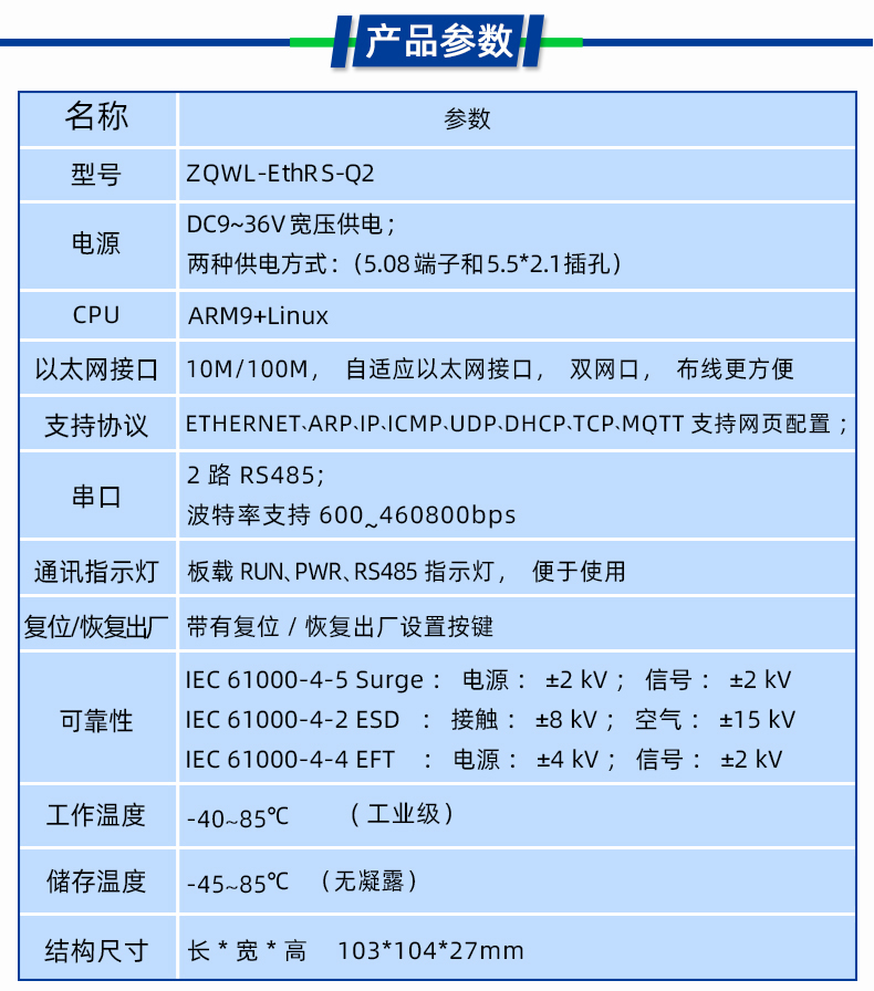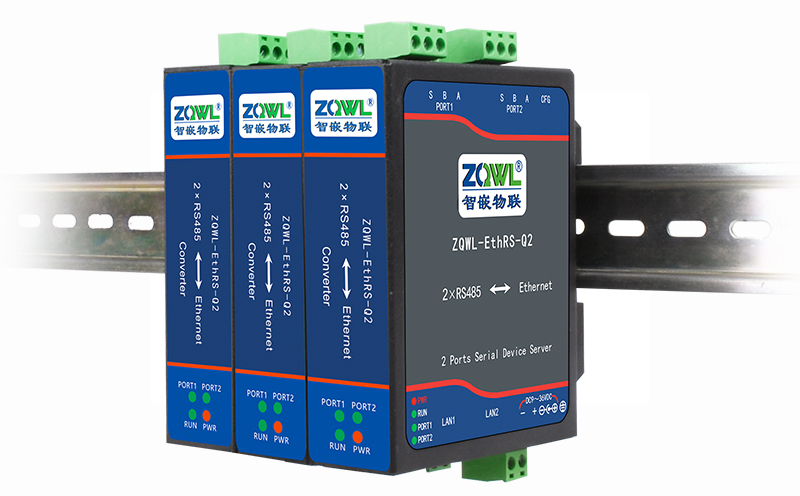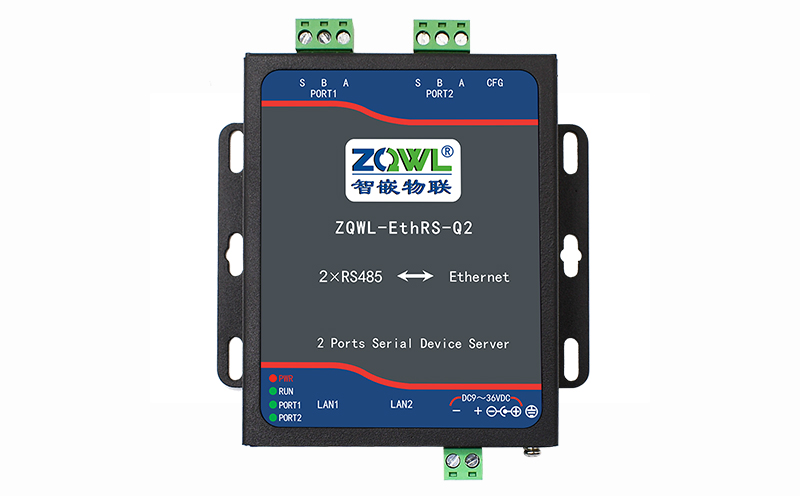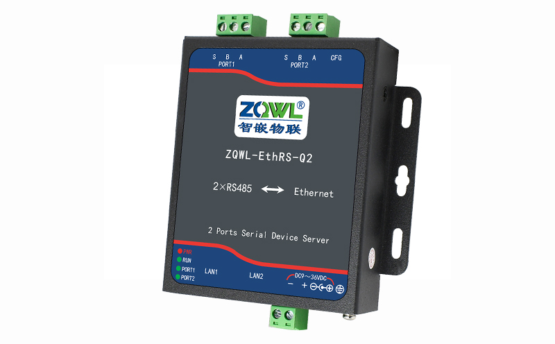 智嵌物联自主研发的串口服务器 ZQWL-EthRS-Q2,具有两路 LAN、两路 RS485 接口。两路 LAN 可用作交换机功能,可以级联,方便布线(手拉手)。CPU 采用 ARM9 内核处理器,系统采用 Linux 系统,内部集成了 TCP/IP 协议栈,可实现串口到以太网口数据的双向透明传输、ModBus 协议转换等功能。设备通过简单的配置,即可轻松实现串口设备的联网、上云等功能。广泛应用于机房监控、智慧农业、环境监控、智能交通、道闸控制、智能快递柜等行业。