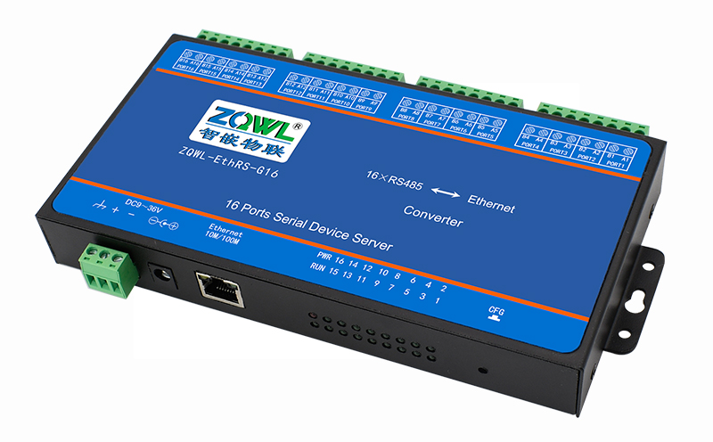 智嵌物联自主研发的串口服务器 ZQWL-EthRS-G16,具有 1 路网口、16 路 RS485 接口。CPU 采用 ARM9 内核处理器,系统采用 Linux 系统,内部集成了 TCP/IP 协议栈,可实现串口到以太网口数据的双向透明传输、ModBus 协议转换等功能。设备通过简单的配置,即可轻松实现串口设备的联网、上云等功能。广泛应用于机房监控、智慧农业、环境监控、智能交通、道闸控制、智能快递柜等行业。