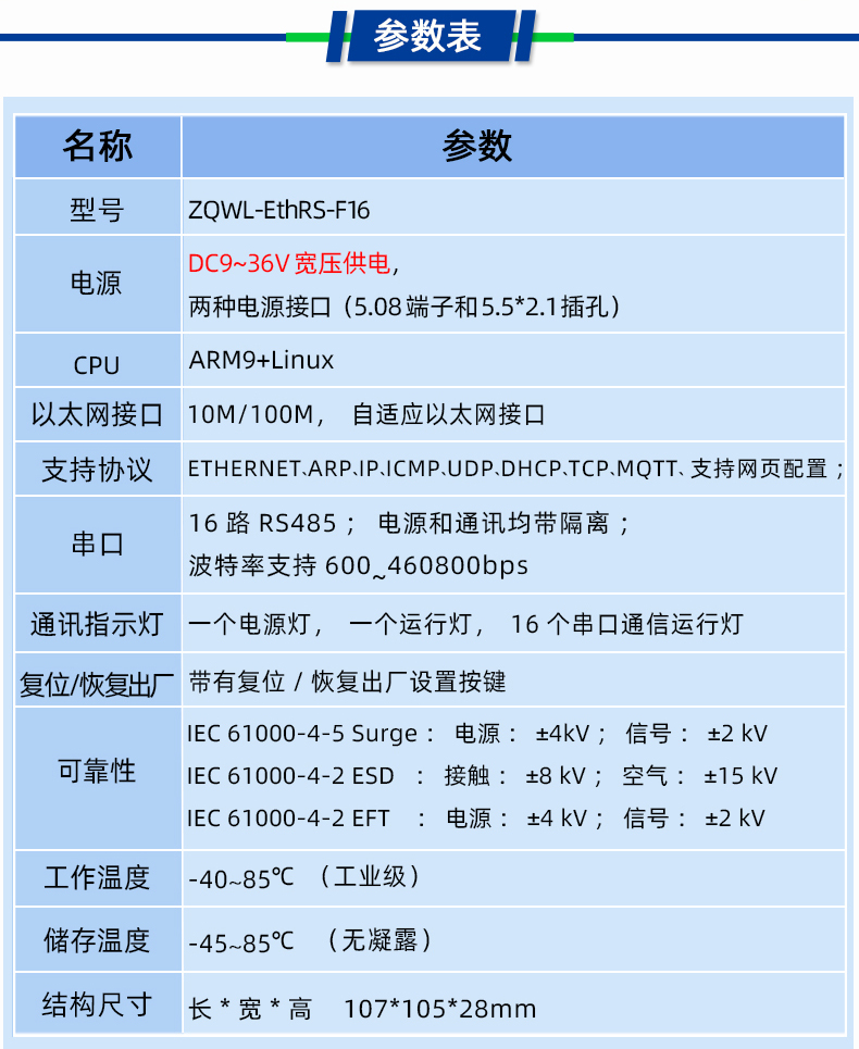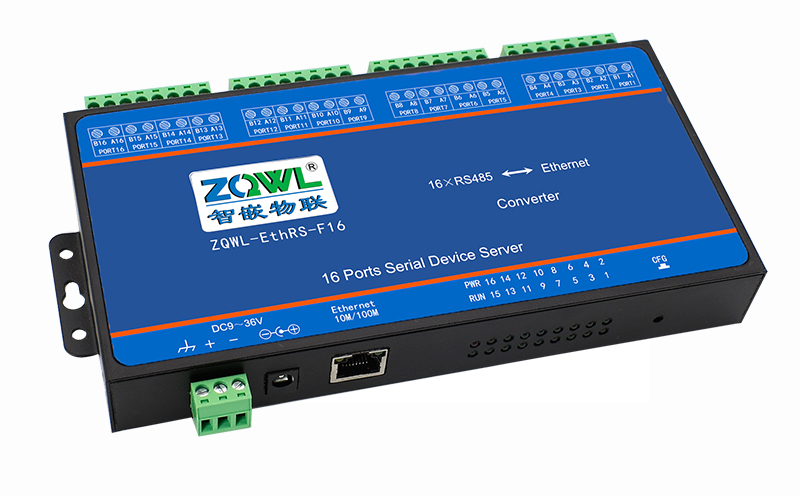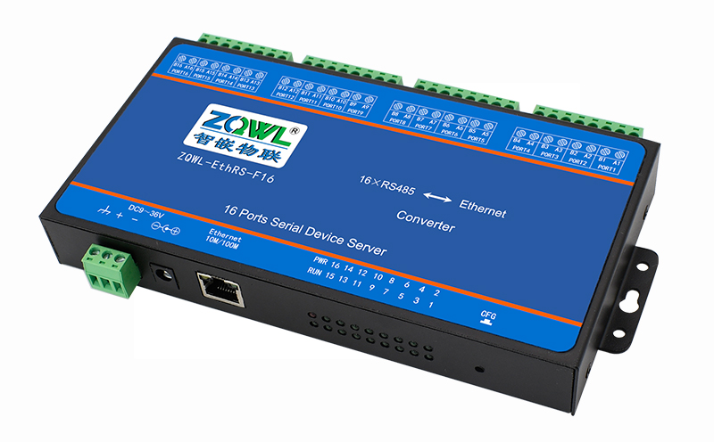 智嵌物联自主研发的串口服务器 ZQWL-EthRS-F16,具有 1 路网口、16 路 RS485 接口。内置电气隔离模块,实现信号、电源全隔离,增强了设备的抗干扰性能。CPU 采用 ARM9 内核处理器,系统采用 Linux 系统,内部集成了