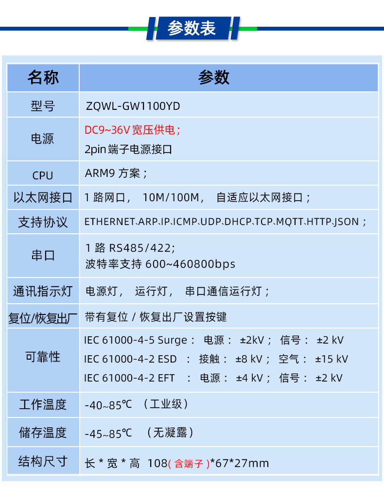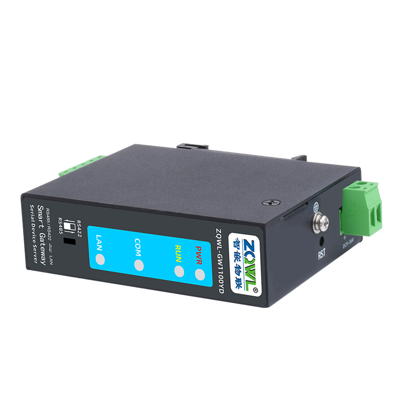 智嵌物联 ZQWL 自主研发的智能网关型串口服务器 ZQWL-GW1100YD,具有 1 路网口、1 路 RS485/RS422。CPU采用 ARM9 内核处理器,内部集成了 TCP/IP 协议栈,可实现串口到以太网口数据的双向透明传输、ModBus 协议转换等功能。设备通过简单的配置,即可轻松实现串口设备的联网、上云等功能。广泛应用于机房监控、智慧农业、环境监控、智能交通、道闸控制、智能快递柜等行业。支持多种通讯协议:MQTT、HTTP、TCP、UDP、JSON、Web Socket、Modbus TCP/RTU 主从等。