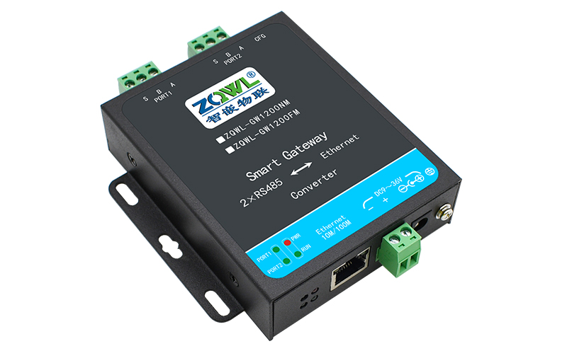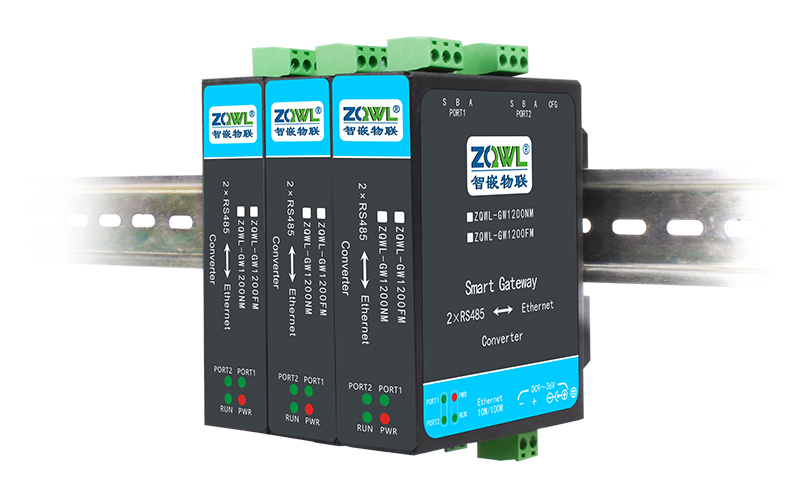 智嵌物联自主研发的串口服务器 ZQWL-GW1200FM,具有 1 路网口、两路 RS485 接口。内置电气隔离模块,实现信号、电源全隔离,增强了设备的抗干扰性能。CPU 采用全新 ARM Cortex-M4 内核,内部集成了 TCP/IP 协议栈,可实现串口到以太网口数据的双向透明传输、ModBus 协议转换等功能。设备通过简单的配置,即可轻松实现串口设备的联网、上云等功能。广泛应用于机房监控、智慧农业、环境监控、智能交通、道闸控制、智能快递柜等行业。
