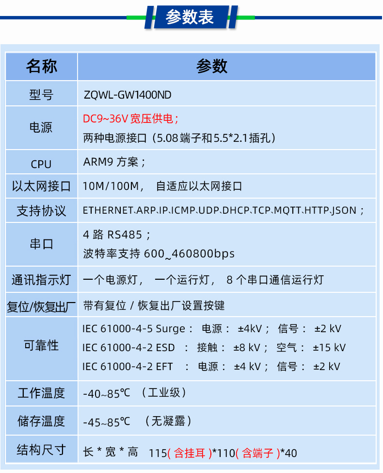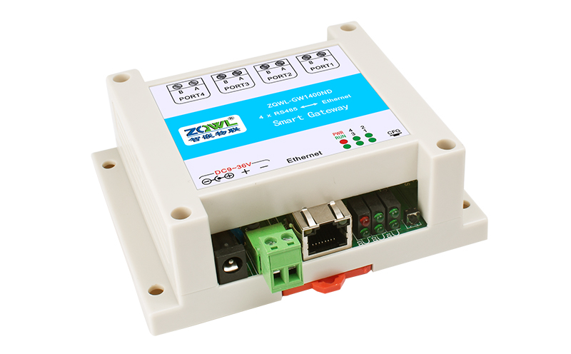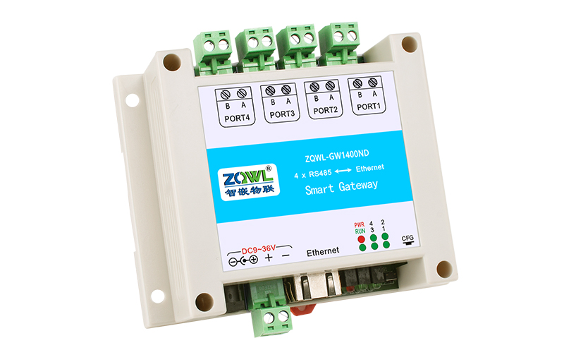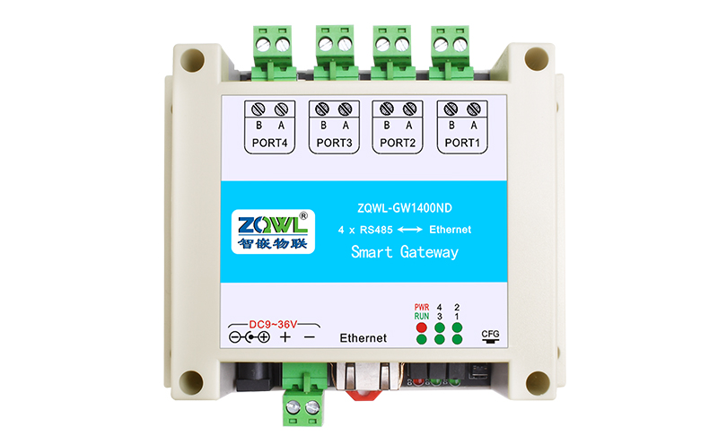智嵌物联 ZQWL 自主研发的智能网关型串口服务器 ZQWL-GW1400ND,具有 1 路网口、四路 RS485接口。CPU 采用 ARM9 内核处理器,内部集成了 TCP/IP 协议栈,可实现串口到以太网口数据的双向透明传输、ModBus协议转换等功能。设备通过简单的配置,即可轻松实现串口设备的联网、上云等功能。广泛应用于机房监控、智慧农业、环境监控、智能交通、道闸控制、智能快递柜等行业。支持多种通讯协议:MQTT、HTTP、TCP、UDP、JSON、Web Socket、Modbus TCP/RTU 主从等。