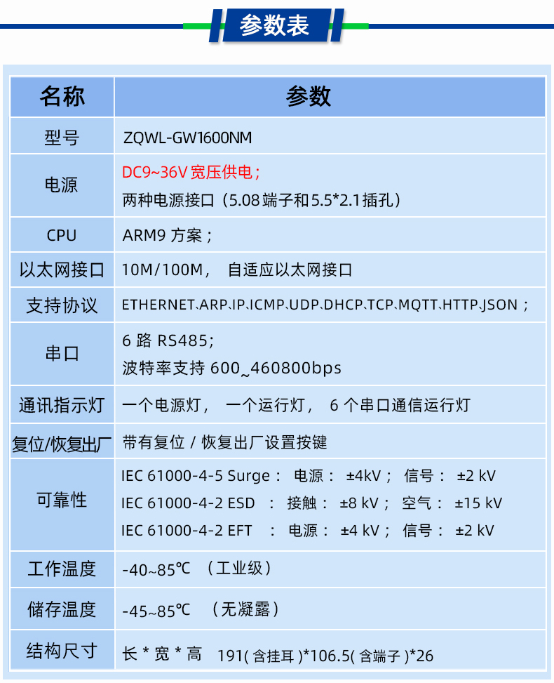 ZQWL-GW1600NM是一款宽压供电、高性能、高稳定性的串口服务器模块,真正的工业级品质。它具有6路RS485接口和1路以太网接口,485选用超强驱动芯片,接口具有ESD防护功能(2KV),防雷功能。用户利用它可以轻松完成串口设备与网络设备的互联,节省人力物力成本。