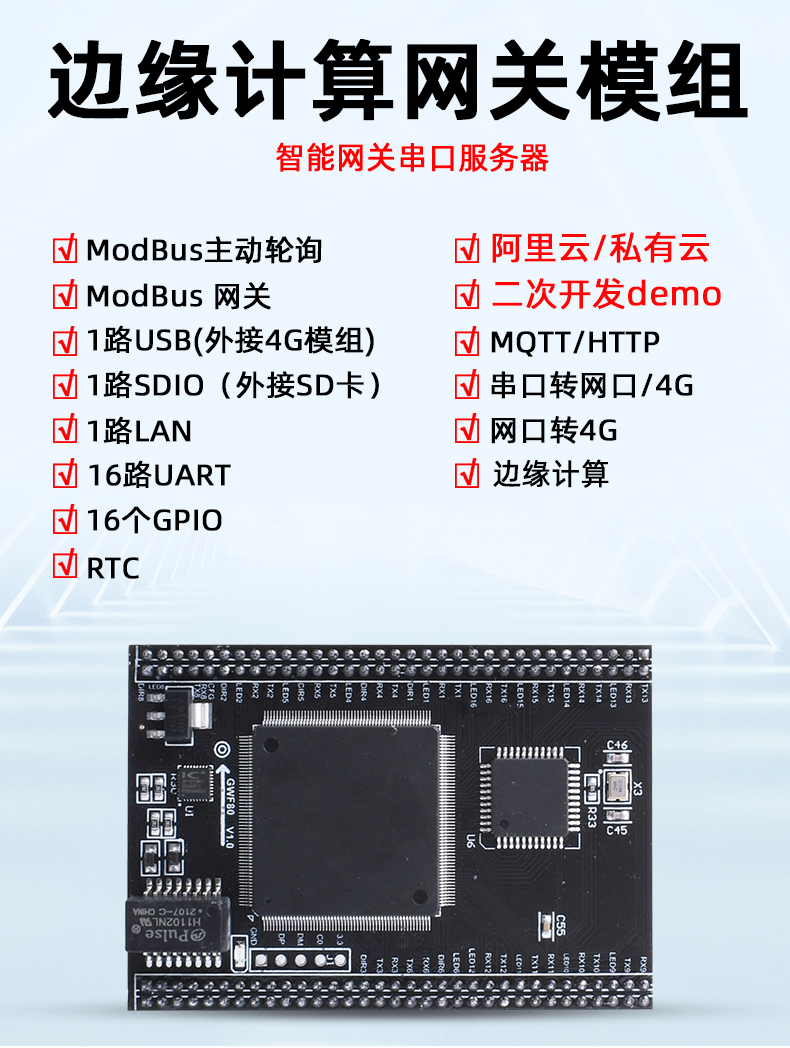 智嵌物联自主研发的智能网关模组 ZQWL-GWF80,具有 1 路网口、16 路串口(TTL 电平)、8 路 DI、8 路 DO、8 路 ADC、1 路 USB(可外接 4G 模组)、1 路 SDIO(可外接 SD 卡)。CPU 采用 ARM9 内核处理器,内部集成了 TCP/IP协议栈,串口通道、网络通道可灵活配置。支持 Modbus 主动轮询,定时上报,可缓解服务器压力。支持二次开发,并提供丰富的 SDK、Demo 等,可快速实现用户的个性化定制。模块化设计,开发简单,可轻松嵌入到用户的设备上。设备通过简单的配置,即可轻松实现串口设备的联网、上云等功能。广泛应用于机房监控、智慧农业、环境监控、智能交通、道闸控制、智能快递柜等行业。