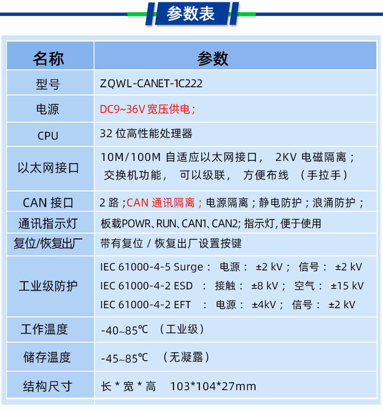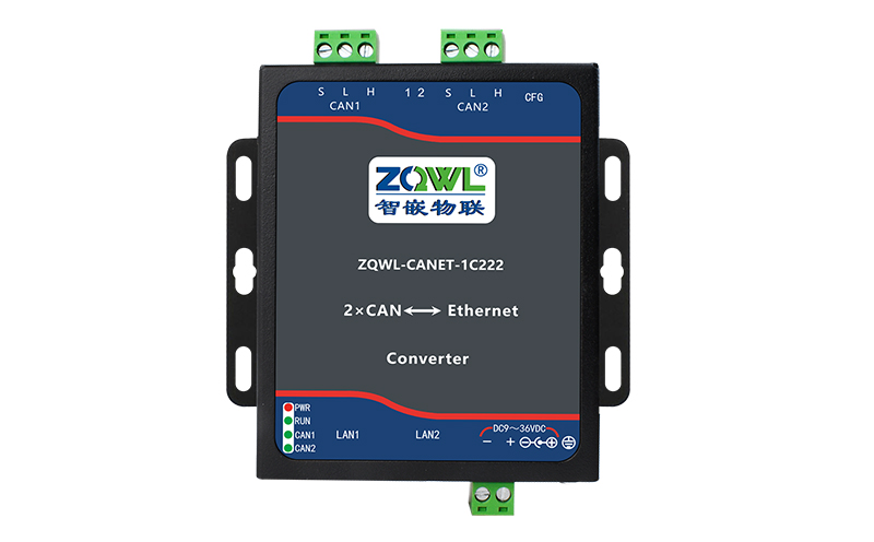 智嵌物联/ZQWL出品的ZQWL-CANET-1C222(以下简称 1C222)是实现 2 路带隔离的 CAN 总线与以太网的数据相互转换的设备。具有双路网络,内置交换机功能。设备的网络参数(如 IP)和 CAN 参数(波特率等)都可以通过配置软件或者网页的方式修改。