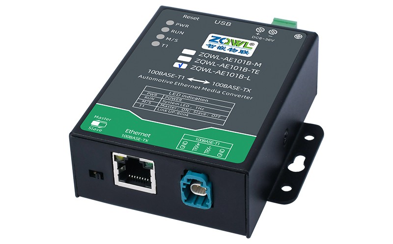 ZQWL-AE101B 是一款百兆车载以太网(100BASE-T1)到 RJ45 普通以太网(100BASE-TX)的转接器。该设备实现了普通以太网和百兆车载以太网的物理层点对点的双向透明转换,不存储或修改任何以太网数据包。
