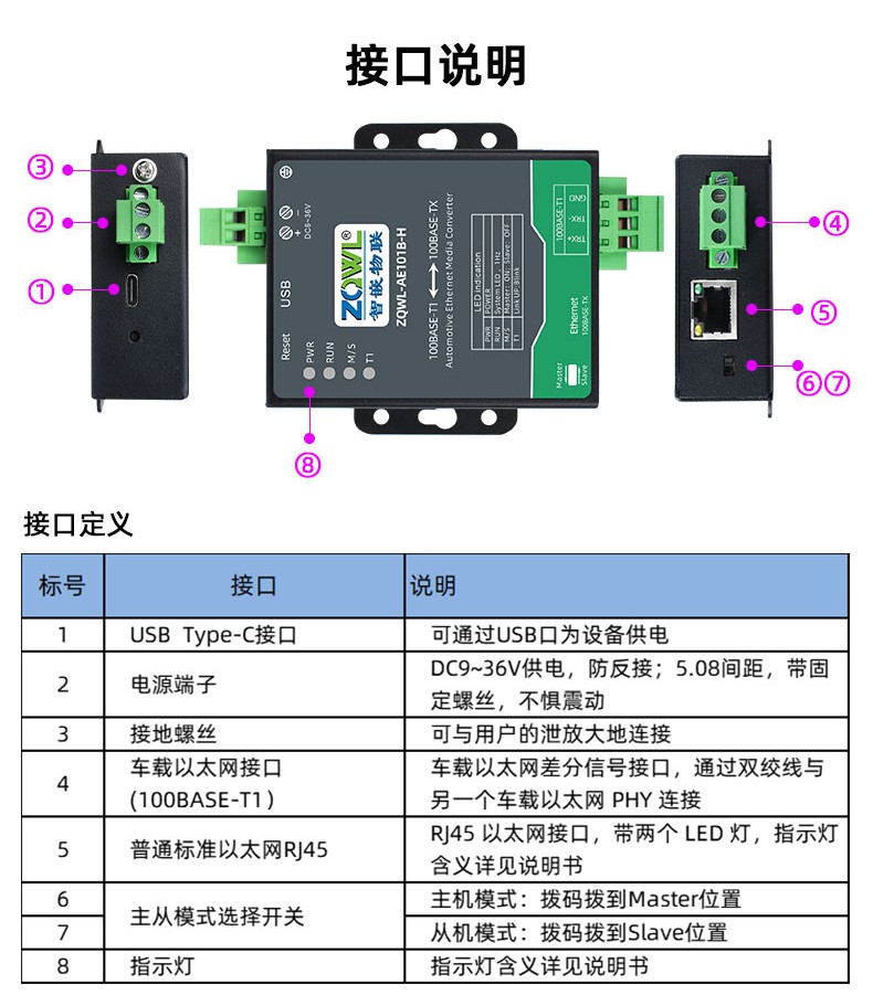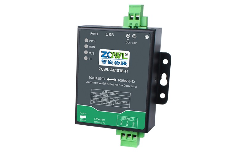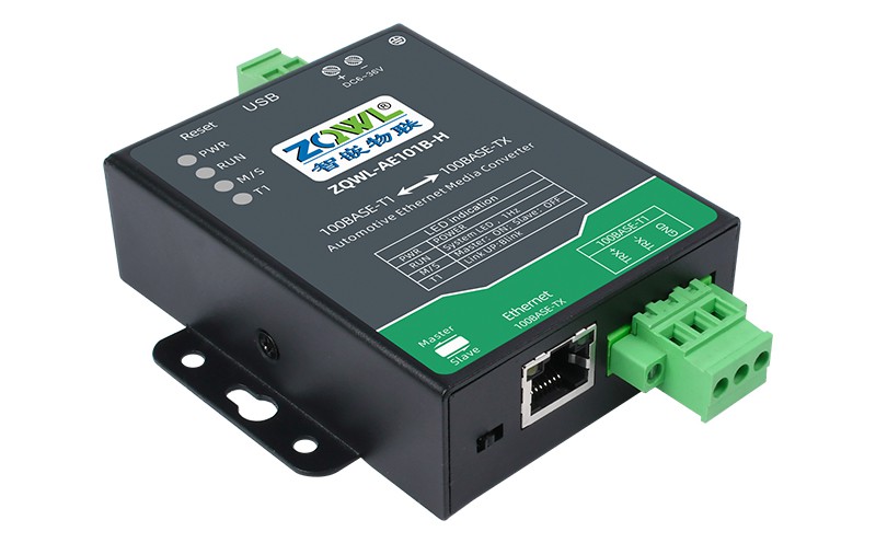 ZQWL-AE101B 是一款百兆车载以太网(100BASE-T1)到 RJ45 普通以太网(100BASE-TX)的转接器。该设备实现了普通以太网和百兆车载以太网的物理层点对点的双向透明转换,不存储或修改任何以太网数据包。