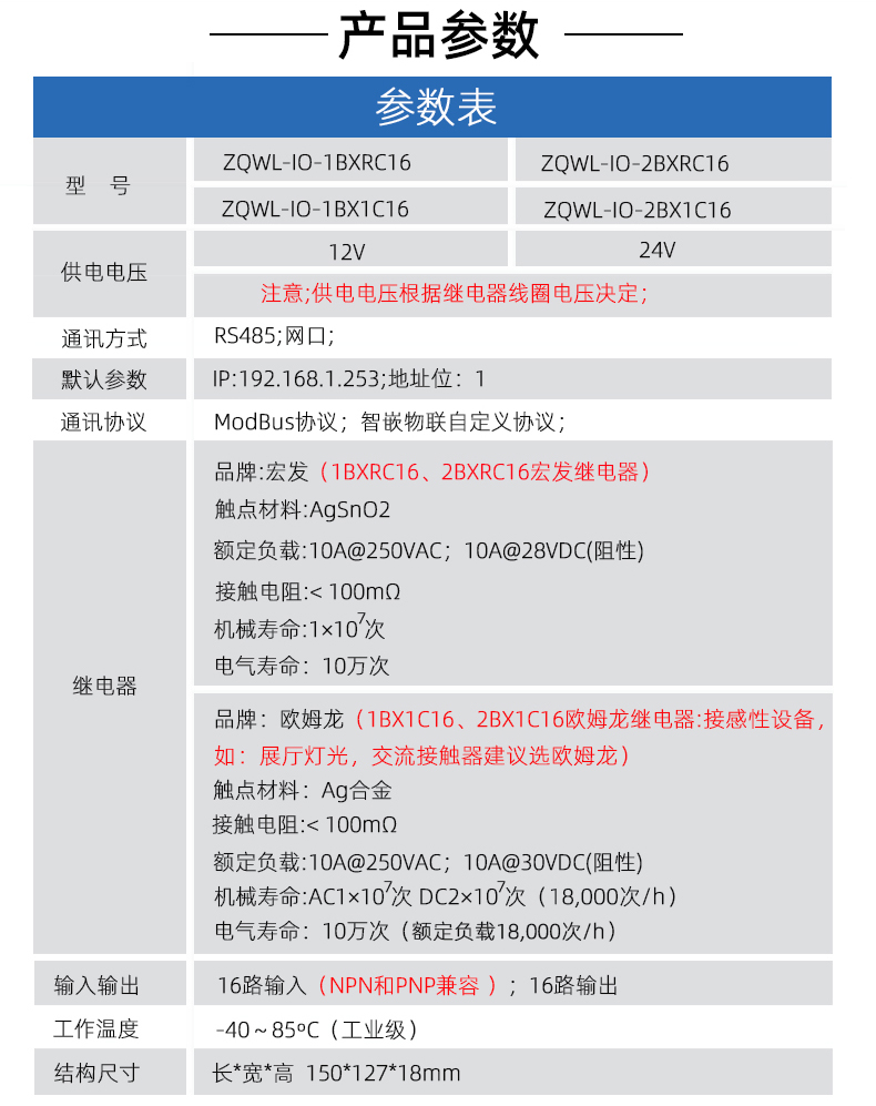 智嵌物联/ZQWL出品的 16 路网络继电器设备,是一款 16 路 NPN 和 PNP 兼容型光电输入、16路继电器输出的工业级 IO 控制板。控制板具有 1 路以太网口和 1 路 RS485 通讯接口,可以通过 Modbus TCP/RTU 或自定义协议实现对该控制板的控制,也可以通过本公司开发的上位机控制软件控制。本控制板具有串口服务器功能(网络和 RS485 数据互相转换)。