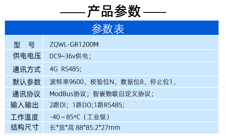 智嵌物联自主研发的 ZQWL-GR1200M,是一款基于电信、联通、移动全网通网络的 4G 网络 IO 控制设备,用户可以轻松实现远程控制、远程检测的目的。设备同时具有 4G DTU 的功能,快速实现串口数据与 4G 网络数据的透明传输,让用户的设备轻松实现与 Internet 的无线连接。本设备网络覆盖范围广,有 4G 信号的地方就能使用,组网安装方便,广泛应用于机房监控、环境监控、智能交通、道闸控制、智能快递柜等行业。