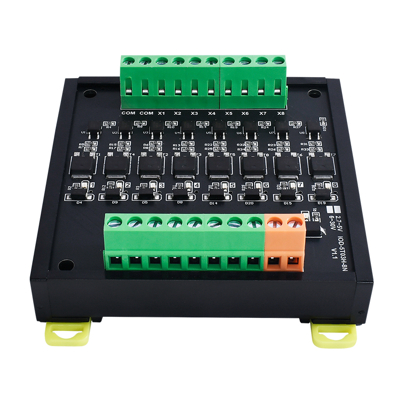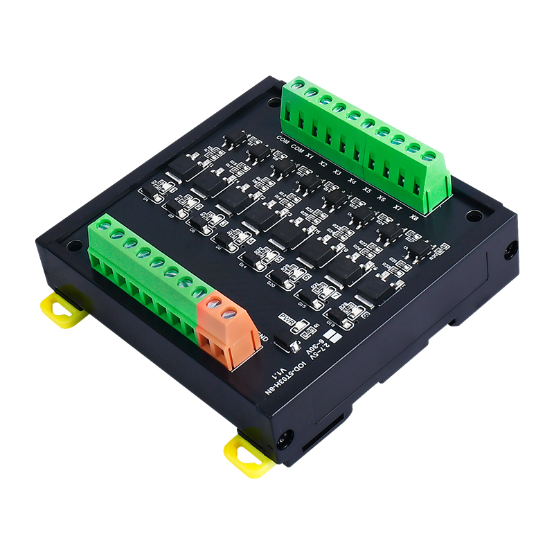 8路光耦隔离型晶体管模组,是实现开关量采集(输入)和晶体管 NPN/PNP 输出的 PLC 放大板,广泛运用于工业控制系统中输入设备与输出设备之间的隔离,电流放大,提高带载能力。产品采用光耦隔离放大输入信号,3KV 的隔离电压有效保护电路。兼容 NPN/PNP 输入,且 NPN/PNP 输出可选,丰富的 LED 状态指示运行灯,外壳采用高品质阻燃材料,耐高温、腐蚀。继电器输出负载电流 10A,晶体管采用高品质场效应管 P 沟道和 N 沟道可选。