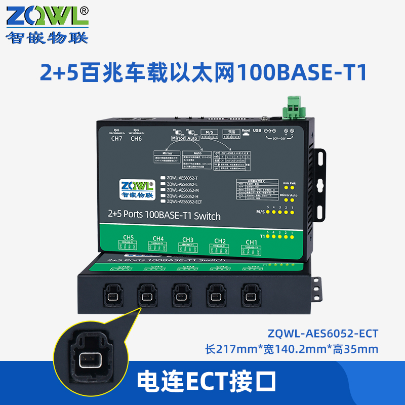 ZQWL-AES6052-T 百兆千兆车载以太网交换机智嵌物联自主研发生产的一款 2+5 端口百兆车载以太网(100BASE-T1)交换机。具有 2 个 RJ45 千兆网口(100BASE-TX/1000BASE-TX)、5 个百兆车载以太网接口(100BASE-T1);设备支持镜像监控模式、端口隔离模式、手动设置模式、全自动模式等;具有丰富的指示灯,设备工作状态一目了然。该设备是最通用的车载以太网工具,可作为动态监听工具、媒介转换器来使用。