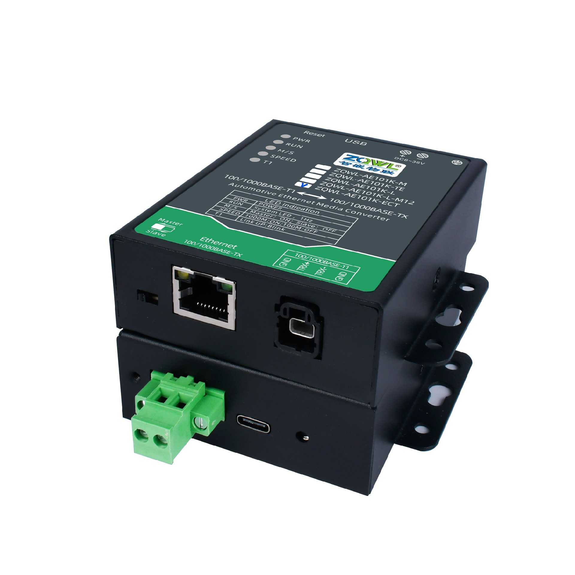ZQWL-AE101K 是一款千兆车载以太网(100/1000BASE-T1)到 RJ45 普通以太网(100/1000BASE-TX)的转接器。该设备实现了普通以太网和千兆车载以太网的物理层点对点的双向透明转换,不存储或修改任何以太网数据包。