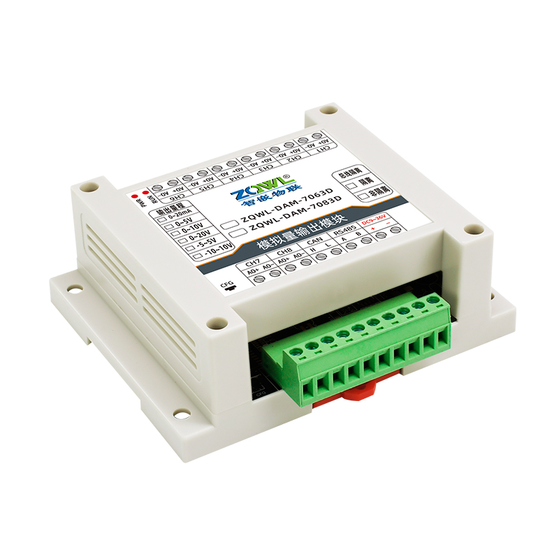 ZQWL-DAM-7063D串口+CAN 双极性模拟量输出系列是智嵌物联推出的高精度模拟量输出模块,输出量程可选:-5~5V;-10~10V,输出精度 0.1%。模块带有 1 路隔离的 RS485 或 CAN 通讯接口,可以通过该接口上传数据。该系列支持标准的有 Modbus RTU 协议,具有 2 种数据输出格式:16 位无符号整型值输出和 32 位标准 IEEE-754 浮点数输出,使用灵活方便。