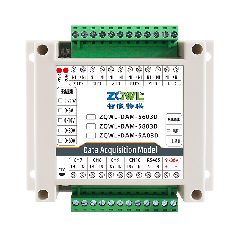 ZQWL-DAM模拟量采集系列是智嵌物联推出的高精度模拟量采集模块,量程可选:0~5V;0~10V;0~30V;0~60V;0~20mA,采集精度0.1%。采集板带有1路隔离的RS485或CAN通讯接口,可以通过该接口上传数据。该系列支持标准的有Modbus RTU协议,具有2种数据输出格式:16位无符号整型值输出和32位标准IEEE-754浮点数输出,使用灵活方便。