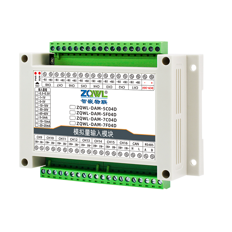 ZQWL-DAM-xx04D 模拟量输入系列是智嵌物联推出的高精度模拟量采集模块,采集量程可选:±0.5V;±1V;±5V;±10V;±30V;±60V;±5mA;±10mA;±20mA,内置1 个或2 个24 bit 的 ADC,采集精度 0.01%(万分之一)。