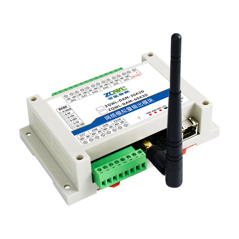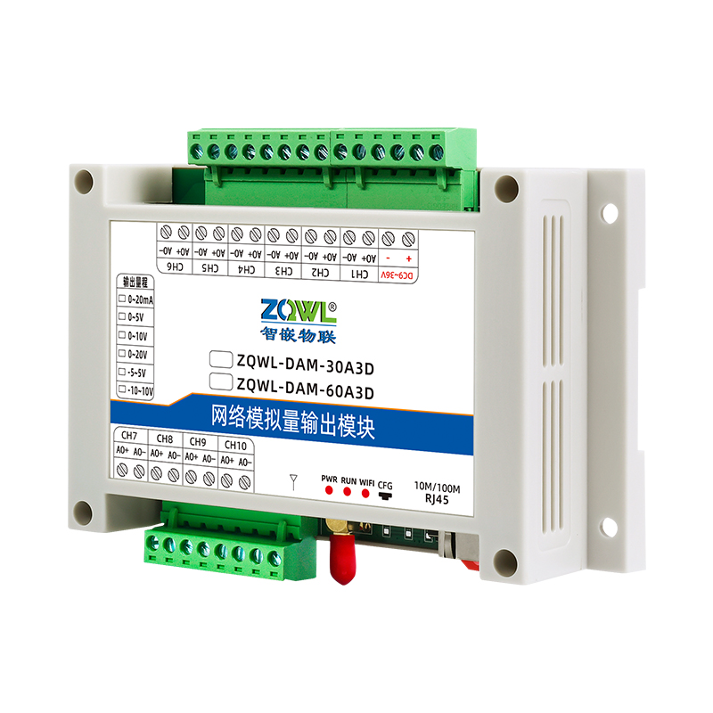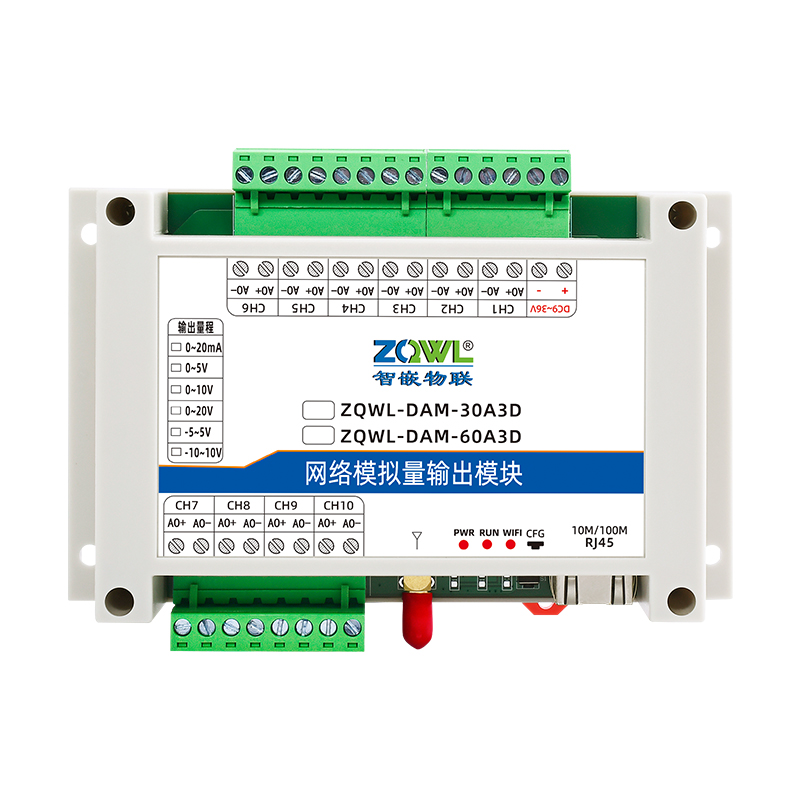 ZQWL-DAM-60A3D 10路单极性模拟量输出系列是智嵌物联推出的高精度模拟量输出模块,输出量程可选: 0~5V;0~10V;0~20V;0~20mA,输出精度 0.1%。模块带有 1 路网口或WIFI,可以通过该接口上传数据。设备内部集成了 TCP/IP 协议栈,支持标准的 Modbus TCP/RTU、MQTT和 JSON 等协议;支持 TCP SERVER、TCP CLIENT、UDP SERVER、UDP CLIENT 等工作模式,提供 2 种数据输出格式:16 位无符号整型值输出和 32 位标准IEEE-754 浮点数输出,使用灵活方便。