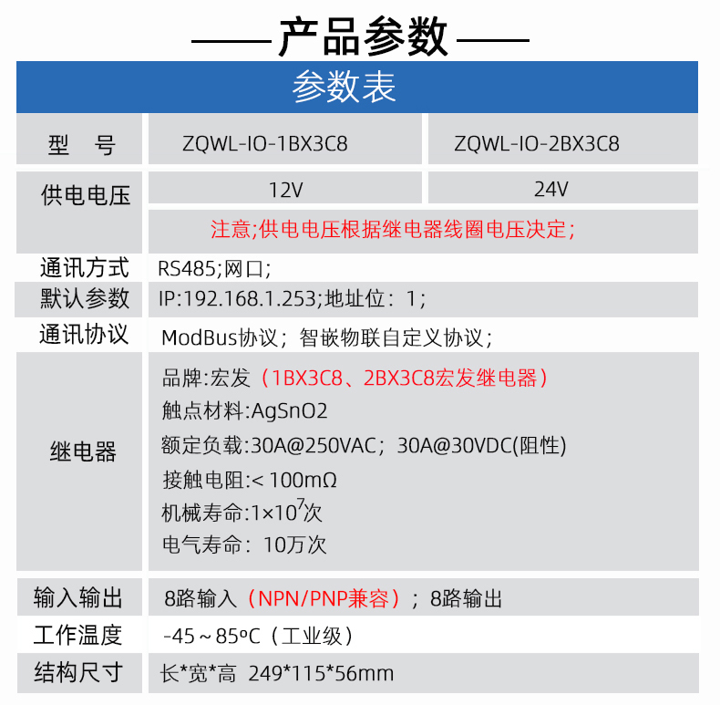 智嵌物联/ZQWL出品的 8 路网络继电器设备,是一款 8 路 NPN 和 PNP 兼容型光电输入、8 路继电器输出的工业级 IO 控制板。控制板具有 1 路以太网口和 1 路 RS485 通讯接口,可以通过 Modbus TCP/RTU 或自定义协议实现对该控制板的控制,也可以通过本公司开发的上位机控制软件控制。本控制板具有串口服务器功能(网络和 RS485 数据互相转换)。
