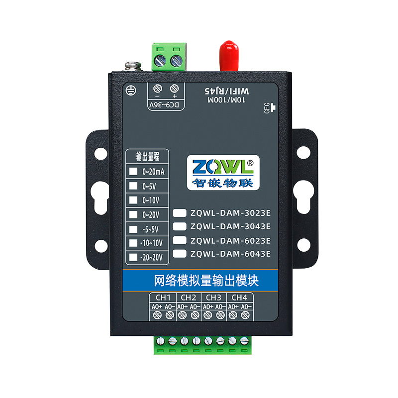 ZQWL-DAM-3043E 单极性模拟量输出是智嵌物联推出的高精度模拟量输出模块,输出量程可选: 0~5V;0~10V;0~20V;0~20mA,输出精度 0.1%。模块带有 1 路网口或 WIFI,可以通过该接口上传数据。设备内部集成了 TCP/IP 协议栈,支持标准的 Modbus TCP/RTU、MQTT和 JSON 等协议;支持 TCP SERVER、TCP CLIENT、UDP SERVER、UDP CLIENT 等工作模式,提供 2 种数据输出格式:16 位无符号整型值输出和 32 位标准 IEEE-754 浮点数输出,使用灵活方便。