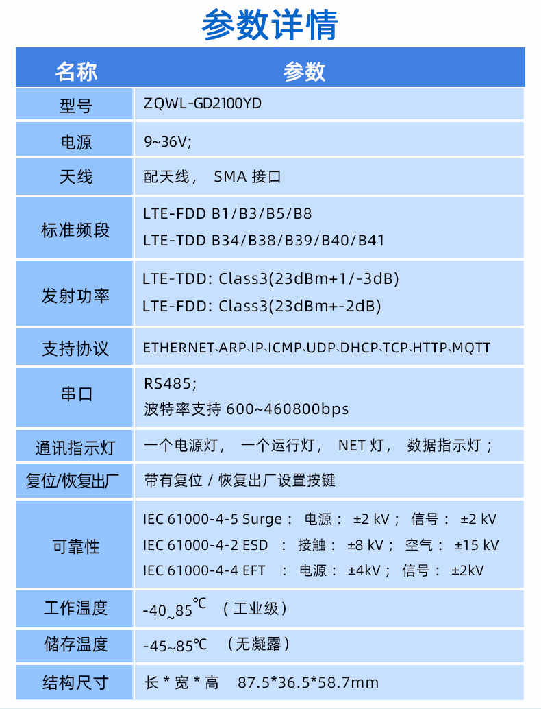 智嵌物联自主研发的 ZQWL-GD2100YD,是一款基于电信、联通、移动全网通网络的 4G DTU 设备,可以轻松实现串口设备与 4G 网络间的数据透传,让用户的串口设备轻松实现与 Internet 的无线连接。本设备网络覆盖范围广,有 4G 信号的地方就能使用,组网安装方便,广泛应用于机房监控、环境监控、智能交通、道闸控制、智能快递柜等行业。