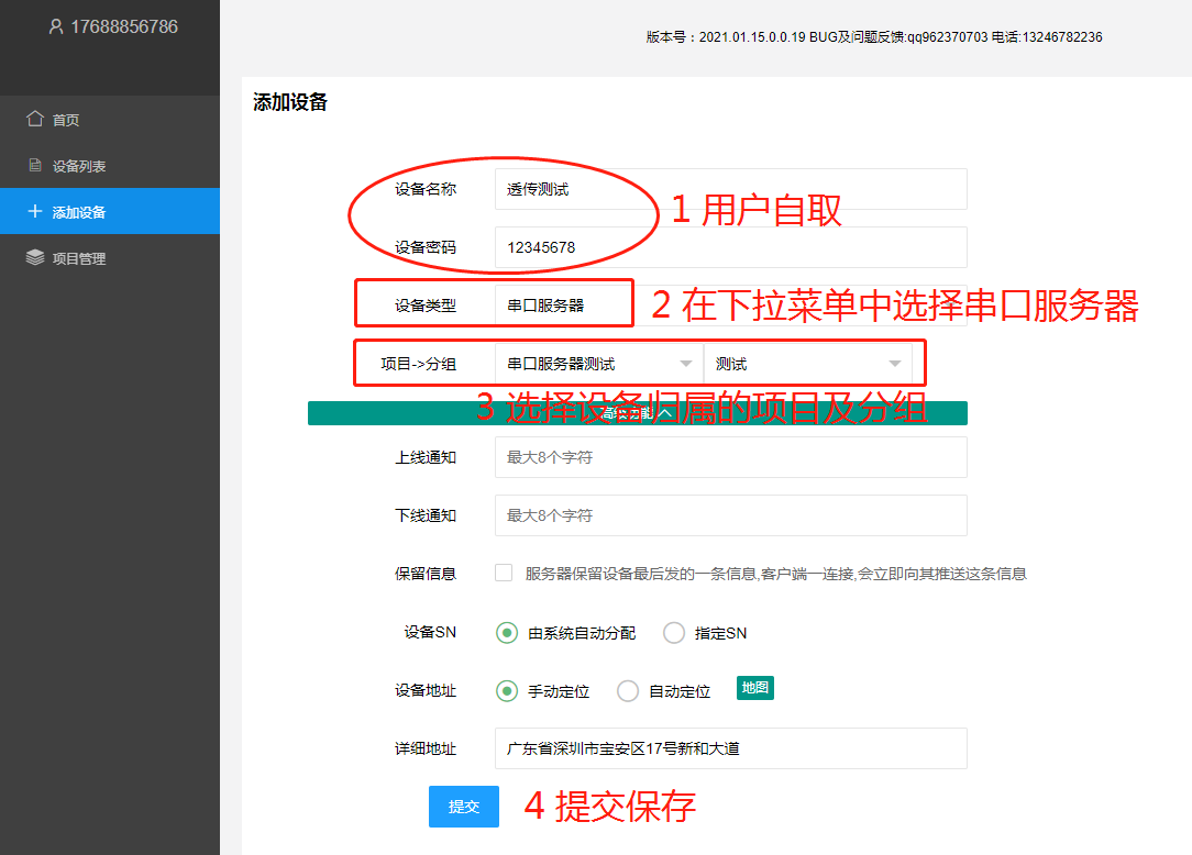 此步骤的目的是在用户的账号下添加该设备,此步完成后,系统会自动生成ID号,该ID号会在绑定设备时用到。