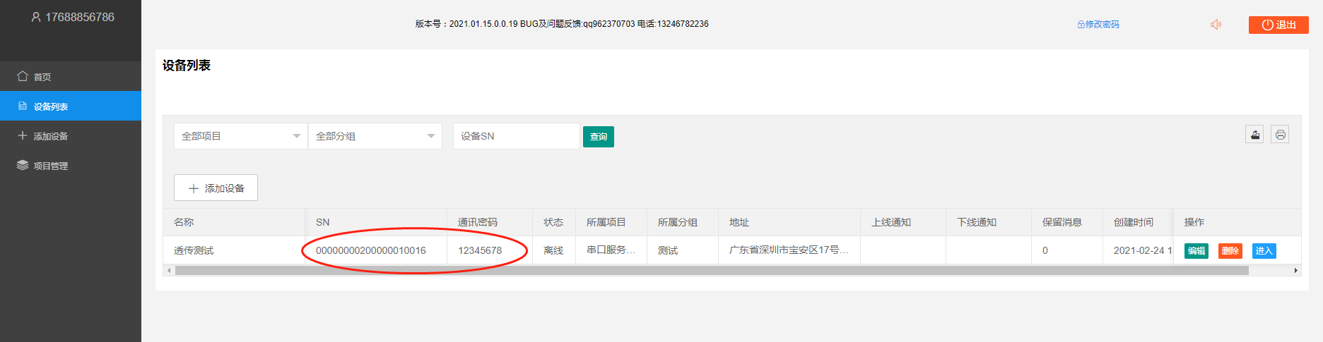设备添加完成后,在设备列表菜单下找到刚添加的设备,复制设备SN及通讯密码,后面备用。
