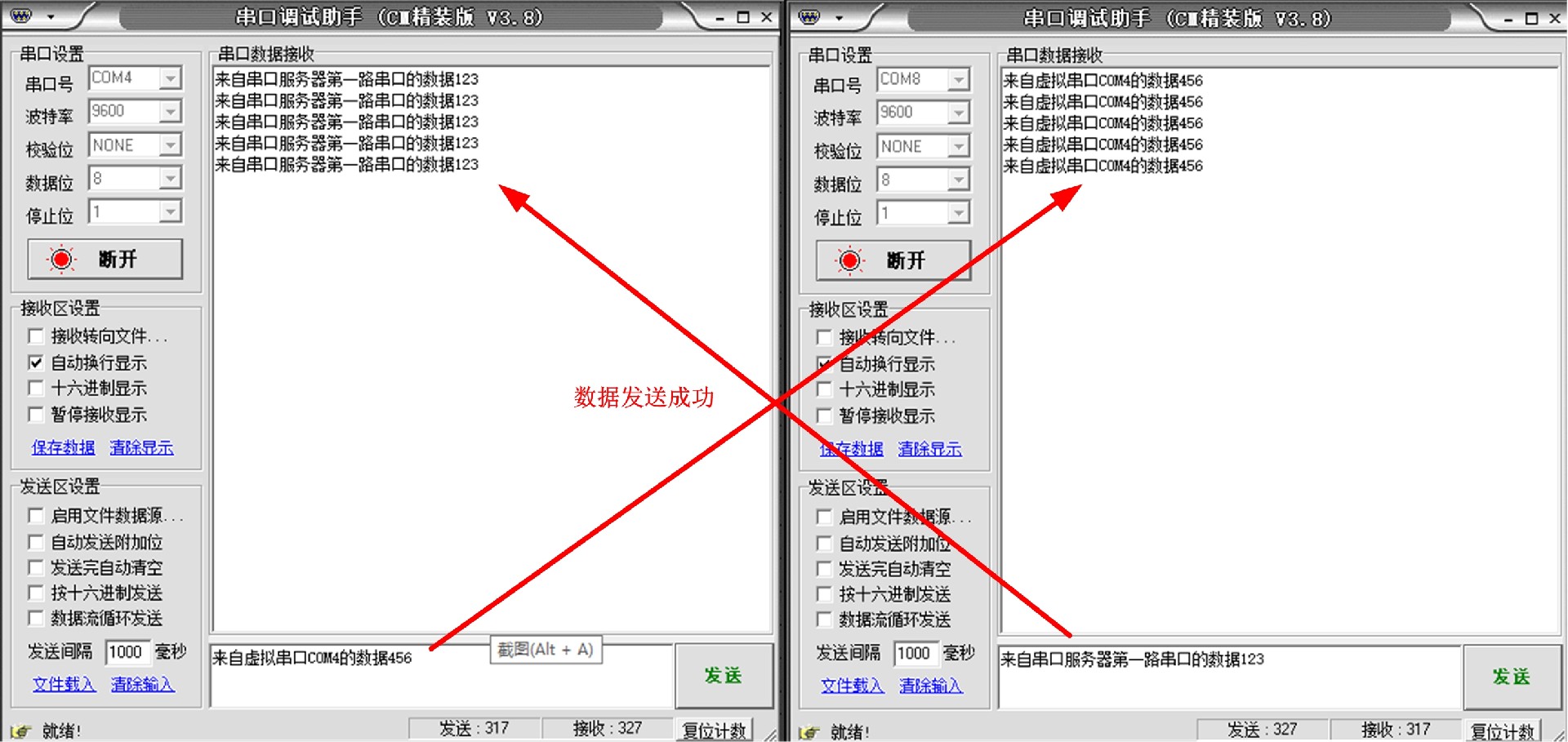 打开两个串口调试助手,一个串口调试助手连接虚拟串口COM4,另外一个串口调试助手连接串口服务器PORT1的对应串口号,如图13所示。配置完成之后,发送数据,如图14所示。
