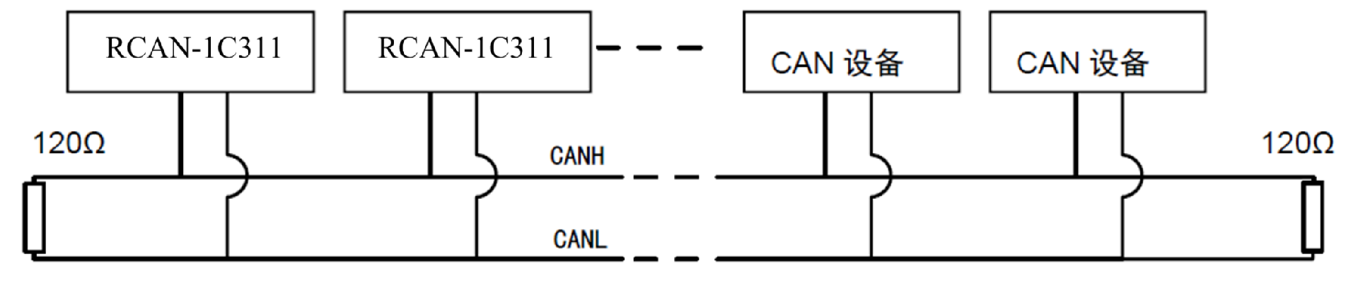 通常要加入终端匹配电阻(120Ω),如下图所示。终端匹配电阻的大小由传输电缆的特性阻抗所决定,例如,双绞线的特性阻抗为120Ω,则总线上的两个端点也应集成120Ω终端电