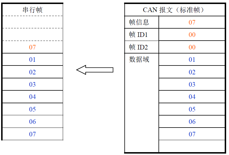 如果收到串的行帧长度小于等于8字节,依序将字符1到n(n为串行帧长度)填充到CAN报文的数据域的1到n个字节位置(如下图中n为7)。