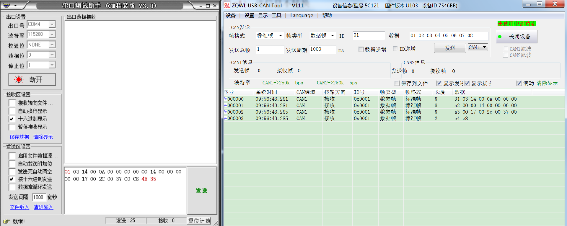 经过以上步骤后,CAN与RS232就可以互相发数据了。
