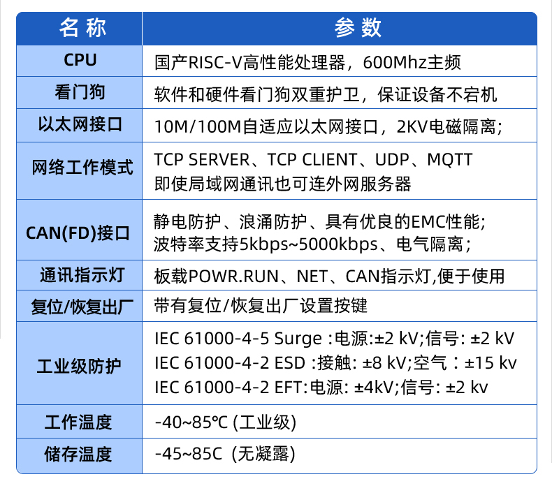 设备的网络工作模式支持 TCP SERVER、TCP CLIENT、UDP、MQTT 模式。在数据协议方面,支持车载模式、工业模式以及自定义脚本。CAN(FD)通道与网络通道可灵活绑定,网络解析协议有多种可选。其中,自定义脚本能够实现自定义的功能逻辑。CAN(FD)波特率最高可达 5Mbps,具备波特率自定义和波特率侦测功能。