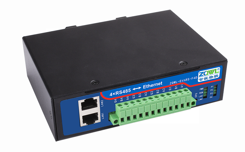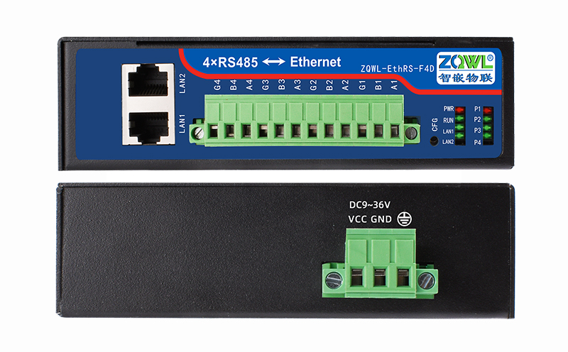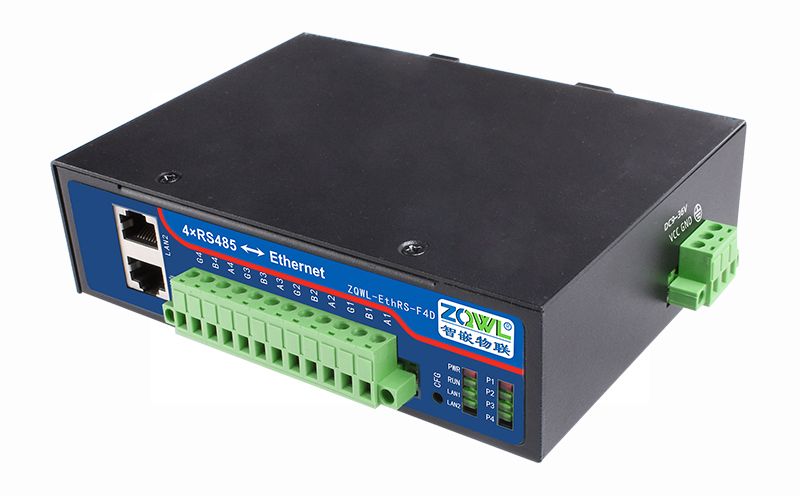 智嵌物联自主研发的串口服务器 ZQWL-EthRS-F4D,具有 2 路网口、4路RS485,通讯带隔离,。CPU 采用 ARM9 内核处理器,系统采用 Linux 系统,内部集成了 TCP/IP 协议栈,可实现串口到以太网口数据的双向透明传输、ModBus 协议转换等功能。设备通过简单的配置,即可轻松实现串口设备的联网、上云等功能。广泛应用于机房监控、智慧农业、环境监控、智能交通、道闸控制、智能快递柜等行业。