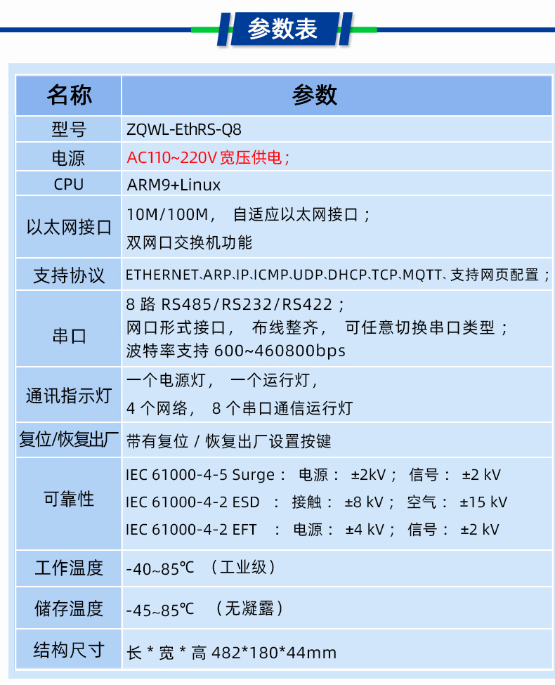 智嵌物联自主研发的串口服务器 ZQWL-EthRS-Q8,具有 1 路网口,8 路 RS485、8 路 RS422、8 路 RS232 接口(每一个串口(PORT)同一时间只能用一种接口功能)。CPU 采用 ARM9 内核处理器,系统采用 Linux 系统,内部集成了 TCP/IP 协议栈,可实现串口到以太网口数据的双向透明传输、ModBus 协议转换等功能。设备通过简单的配置,即可轻松实现串口设备的联网、上云等功能。广泛应用于机房监控、智慧农业、环境监控、智能交通、道闸控制、智能快递柜等行业。