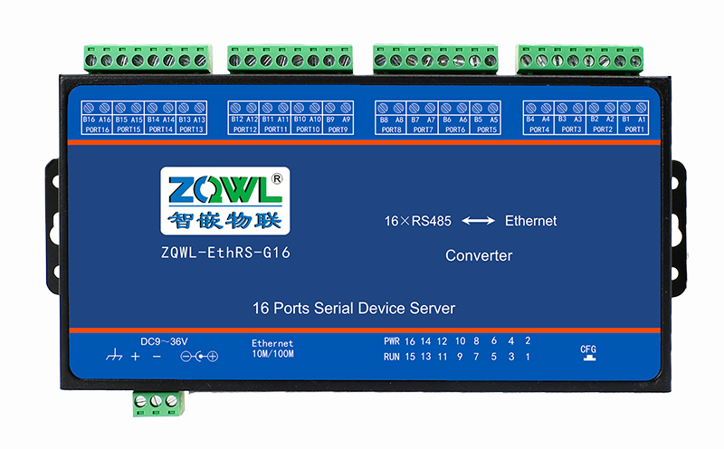 智嵌物联自主研发的串口服务器 ZQWL-EthRS-G16,具有 1 路网口、16 路 RS485 接口。CPU 采用 ARM9 内核处理器,系统采用 Linux 系统,内部集成了 TCP/IP 协议栈,可实现串口到以太网口数据的双向透明传输、ModBus 协议转换等功能。设备通过简单的配置,即可轻松实现串口设备的联网、上云等功能。广泛应用于机房监控、智慧农业、环境监控、智能交通、道闸控制、智能快递柜等行业。