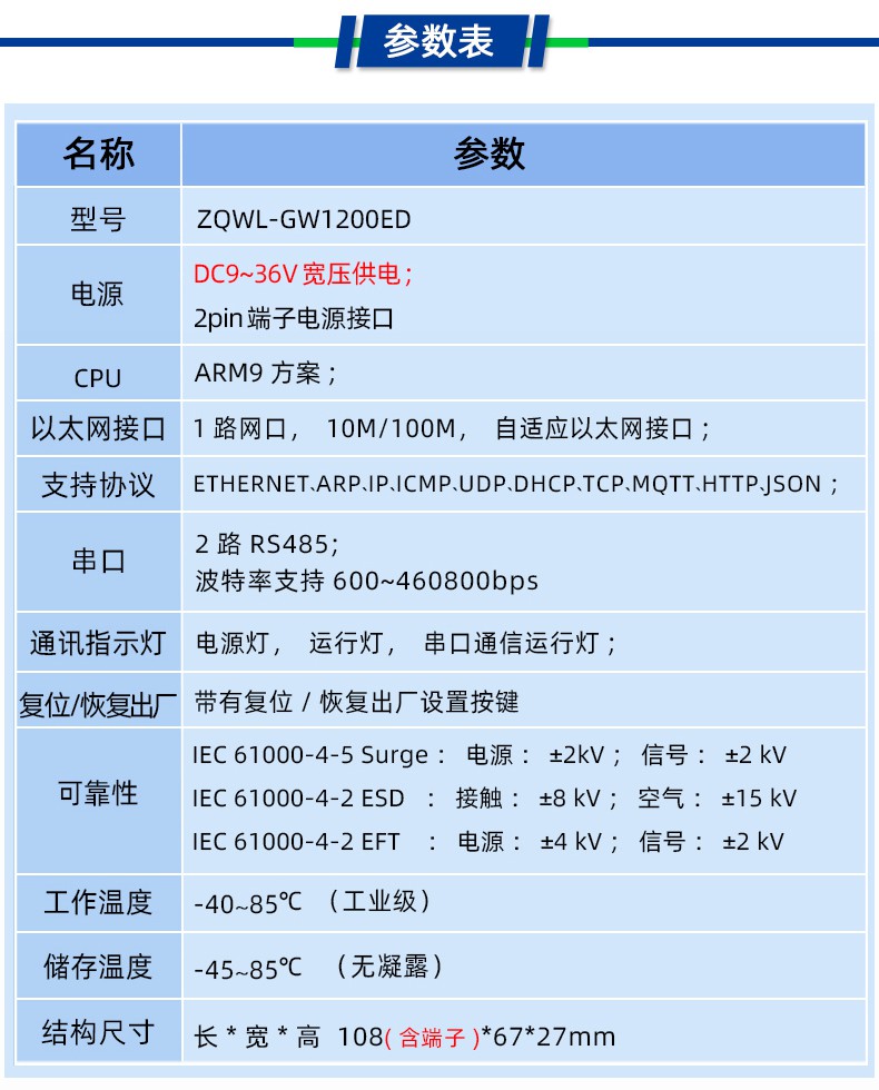 智嵌物联 ZQWL 自主研发的智能网关型串口服务器 ZQWL-GW1200ED,具有 1 路网口、2 路 RS485。CPU 采用ARM9 内核处理器,内部集成了 TCP/IP 协议栈,可实现串口到以太网口数据的双向透明传输、ModBus 协议转换等功能。设备通过简单的配置,即可轻松实现串口设备的联网、上云等功能。广泛应用于机房监控、智慧农业、环境监控、智能交通、道闸控制、智能快递柜等行业。支持多种通讯协议:MQTT、HTTP、TCP、UDP、JSON、Web Socket、Modbus TCP/RTU 主从等。