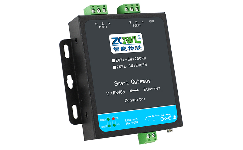 智嵌物联自主研发的串口服务器 ZQWL-GW1200FM,具有 1 路网口、两路 RS485 接口。内置电气隔离模块,实现信号、电源全隔离,增强了设备的抗干扰性能。CPU 采用全新 ARM Cortex-M4 内核,内部集成了 TCP/IP 协议栈,可实现串口到以太网口数据的双向透明传输、ModBus 协议转换等功能。设备通过简单的配置,即可轻松实现串口设备的联网、上云等功能。广泛应用于机房监控、智慧农业、环境监控、智能交通、道闸控制、智能快递柜等行业。