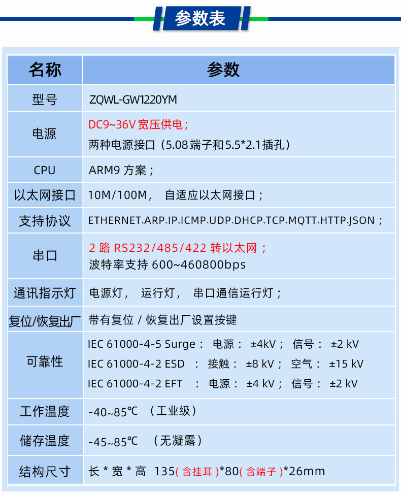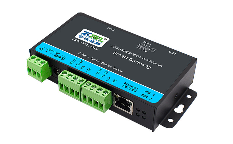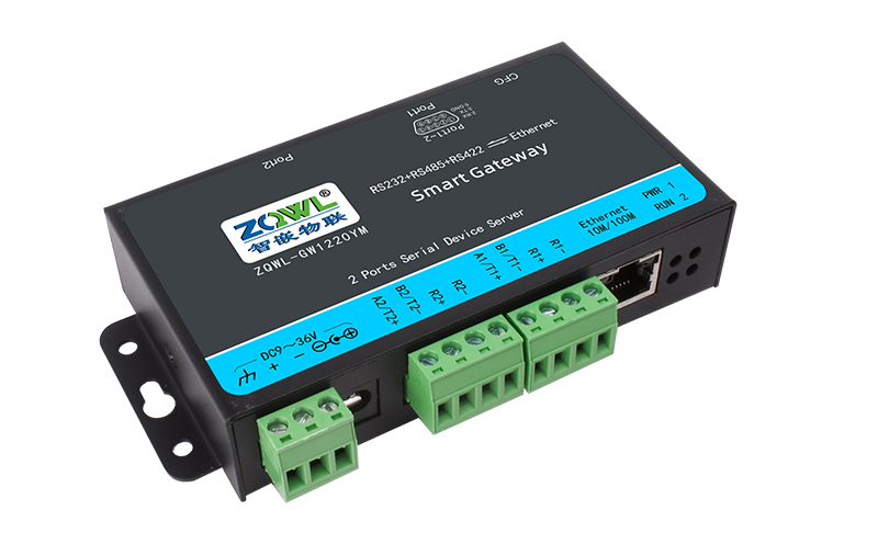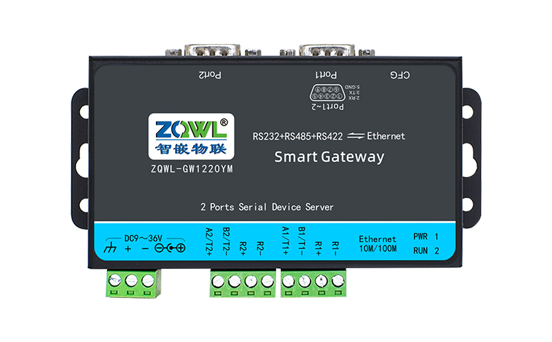 智嵌物联 ZQWL 自主研发 的 智 能 网 关 型 串 口 服 务 器 ZQWL-GW1220YM , 具 有 1 路 网 口 、 2 路RS485/RS422/RS232。CPU 采用 ARM9 内核处理器,内部集成了 TCP/IP 协议栈,可实现串口到以太网口数据的双向透明传输、ModBus 协议转换等功能。设备通过简单的配置,即可轻松实现串口设备的联网、上云等功能。广泛应用于机房监控、智慧农业、环境监控、智能交通、道闸控制、智能快递柜等行业。支持多种通讯协议:MQTT、HTTP、TCP、UDP、JSON、Web Socket、Modbus TCP/RTU 主从等。