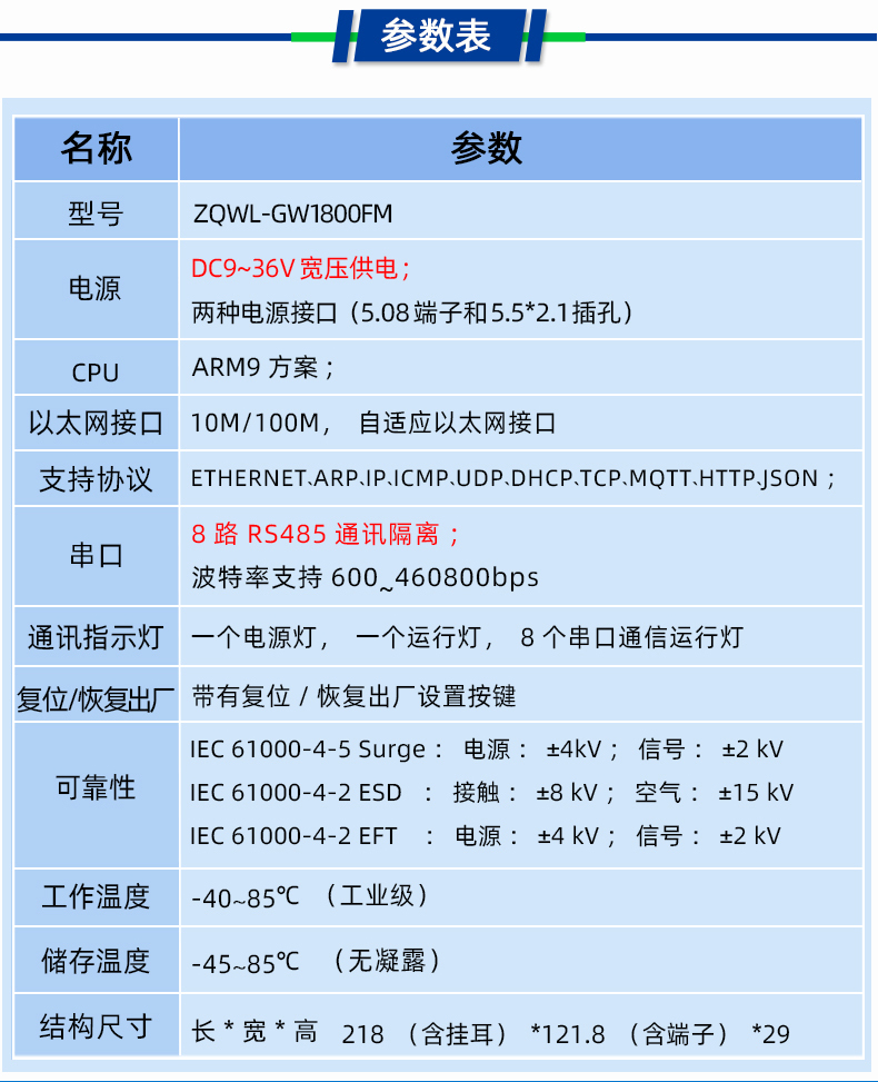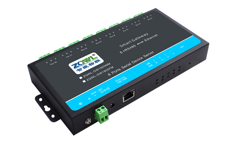 ZQWL-GW1800FM是一款宽压供电、通讯/电源全隔离、高性能、高稳定性的串口服务器模块,真正的工业级品质。它具有8路RS485接口和1路以太网接口,485选用超强驱动芯片,可以带多达256个节点。用户利用它可以轻松完成串口设备与网络设备的互联,节省人力物力成本。