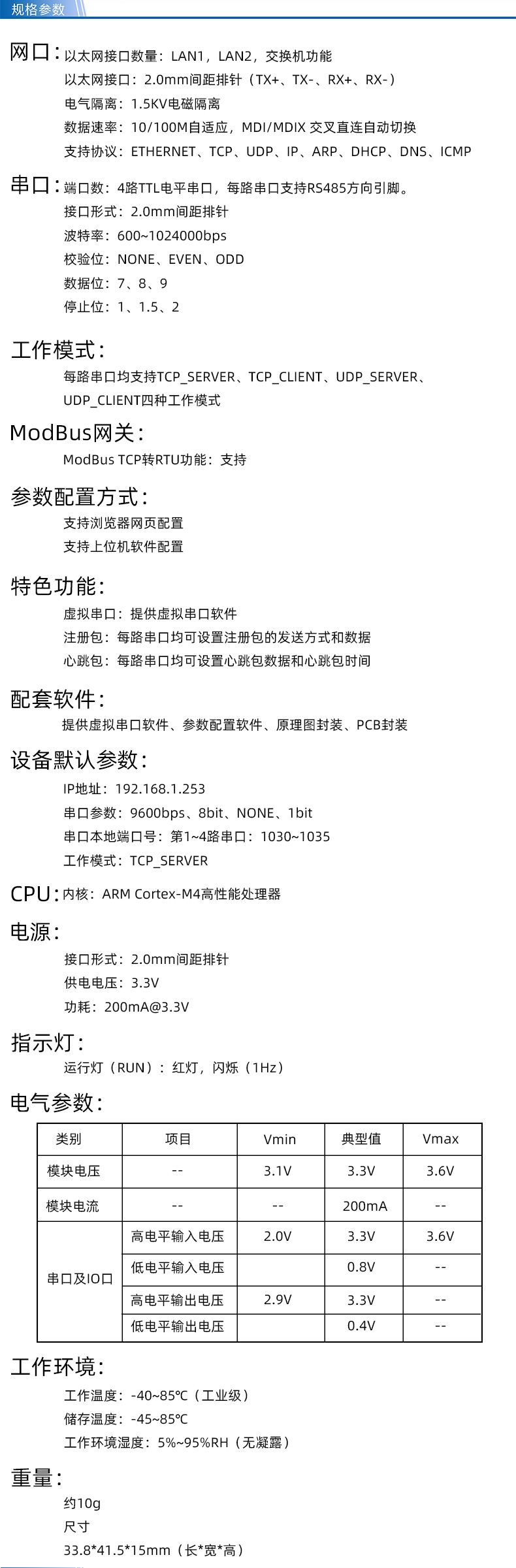 智嵌物联自主研发的串口服务器模块ZQWL-EthRS-T4,具有1路网口、四路串(TTL电平),每路均带有方向控制,可以方便的实现RS485通讯。两路LAN可用作交换机功能,可以级联,方便布线(手拉手)。CPU采用全新ARM Cortex-M4内核,内部集成了TCP/IP协议栈,可实现串口到以太网口数据的双向透明传输、ModBus协议转换等功能。模块化设计,开发简单,可轻松嵌入到用户的设备上。模块通过简单的配置,即可轻松实现串口设备的联网、上云等功能。广泛应用于机房监控、智慧农业、环境监控、智能交通、道闸控制、智能快递柜等行业。