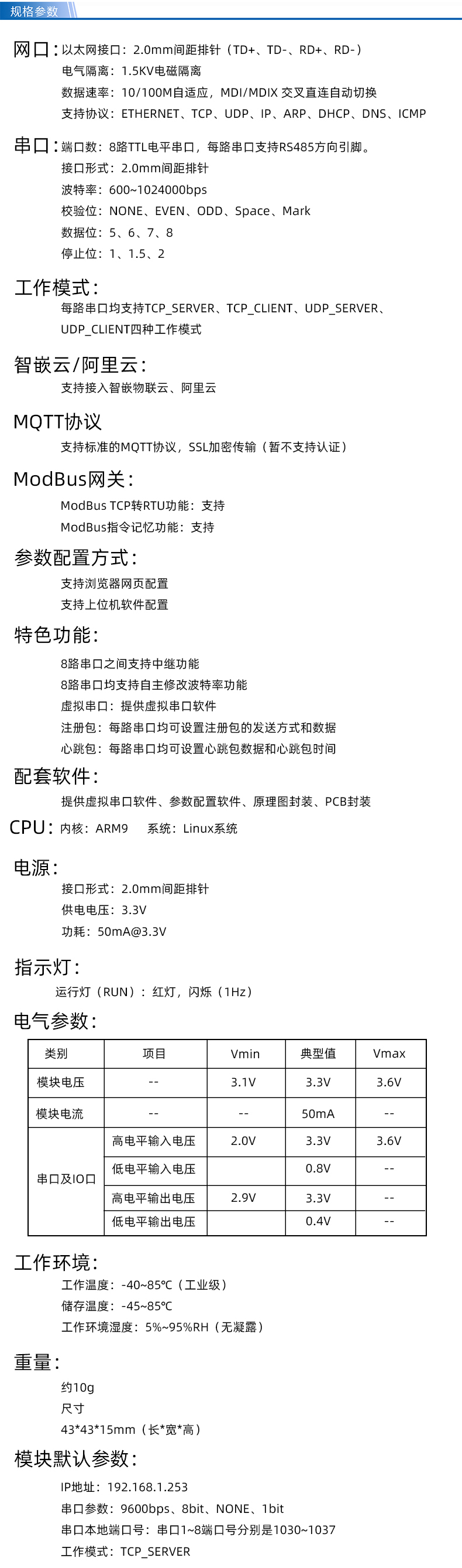 智嵌物联自主研发的串口服务器模块 ZQWL-EthRS-L8,具有 1 路网口、8 路串口(TTL 电平)。CPU 采用 ARM9内核处理器,系统采用 Linux 系统,内部集成了 TCP/IP 协议栈,可实现串口到以太网口数据的双向透明传输、ModBus协议转换等功能。模块化设计,开发简单,可轻松嵌入到用户的设备上。设备通过简单的配置,即可轻松实现串口设备的联网、上云等功能。广泛应用于机房监控、智慧农业、环境监控、智能交通、道闸控制、智能快递柜等行业。
