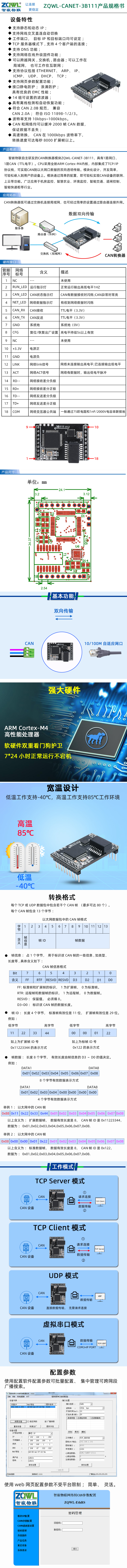 智嵌物联/ZQWL出品的ZQWL-CANET-3B111(以下简称 3B111)是实现 CAN 总线(TTL 电平)与以太网的数据相互转换的设备。设备的网络参数(如 IP)和 CAN 参数(波特率等)都可以通过配置软件或者网页的方式修改。