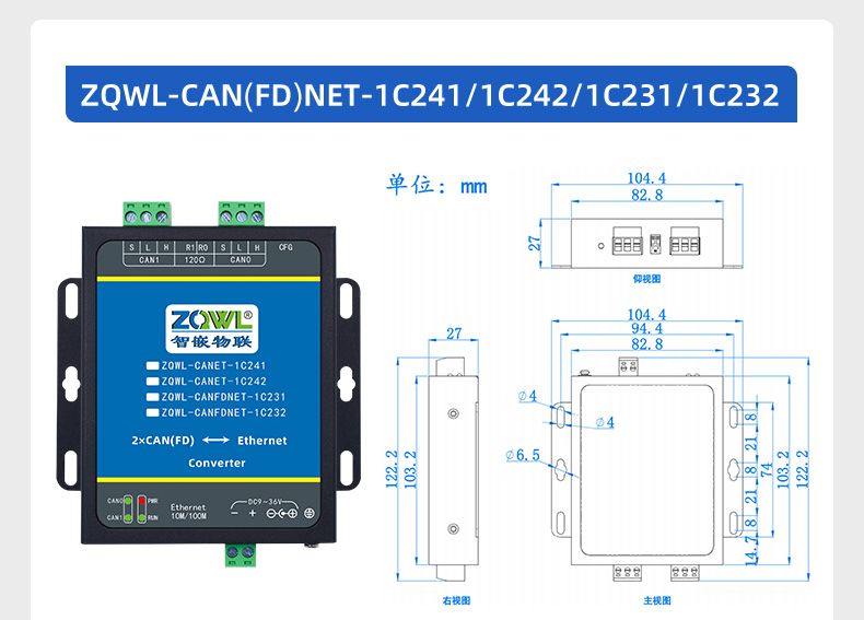 ZQWL-CANFDNET 系列产品,两款外形尺寸一样,CANET-1C142支持通讯隔离,是智嵌物联开发的高性能工业级以太网与 CAN(FD)-bus数据转换的设备。设备型号齐全,按 CAN(FD)通道数可分为单路、双路和 4 路,CAN(FD)总线既有带隔离的,有非隔离的。按照网口数可以分为单网口和双网口(交换机功能),10/100M 自适应,其中双网口类型设备,非常方便用户级联使用。该系列所有产品均可工作在-40℃~85℃,其中隔离型产品具有优秀的抗电磁干扰性能,适用于电磁环境恶劣的的场合。