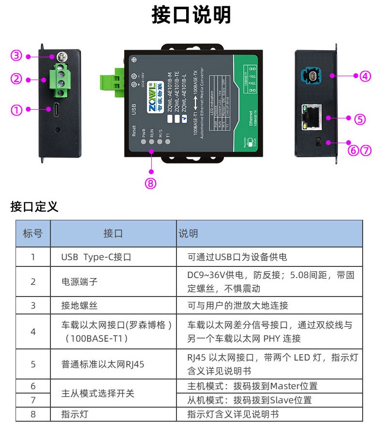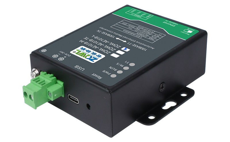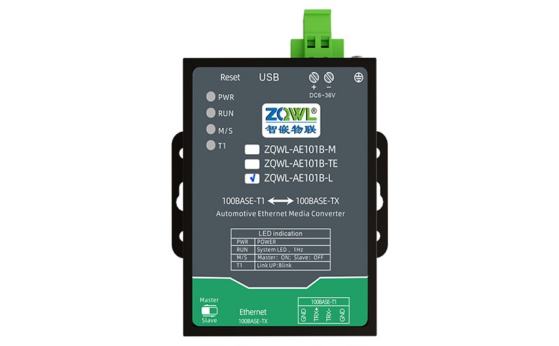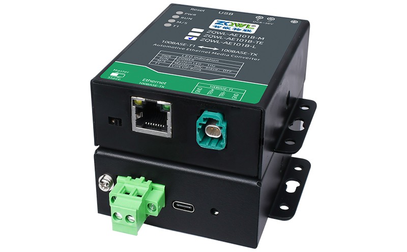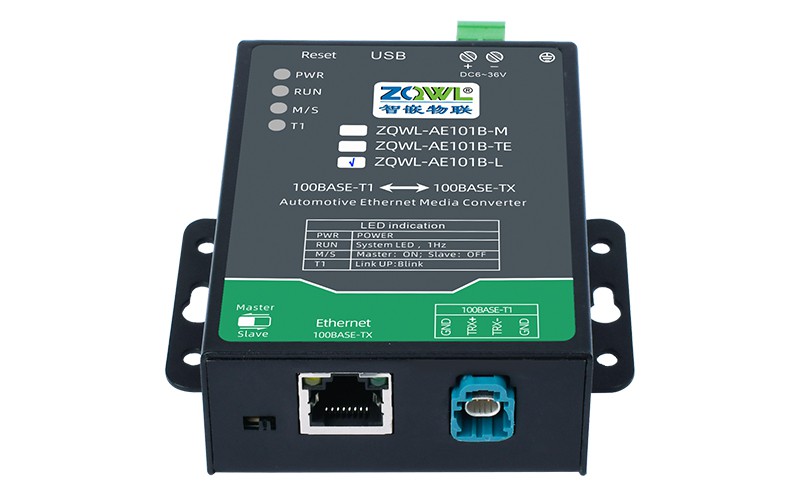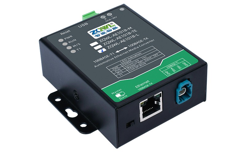 ZQWL-AE101B 是一款百兆车载以太网(100BASE-T1)到 RJ45 普通以太网(100BASE-TX)的转接器。该设备实现了普通以太网和百兆车载以太网的物理层点对点的双向透明转换,不存储或修改任何以太网数据包。