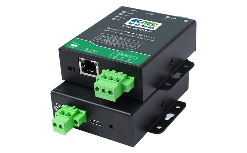 ZQWL-AE101B 是一款百兆车载以太网(100BASE-T1)到 RJ45 普通以太网(100BASE-TX)的转接器。该设备实现了普通以太网和百兆车载以太网的物理层点对点的双向透明转换,不存储或修改任何以太网数据包。
