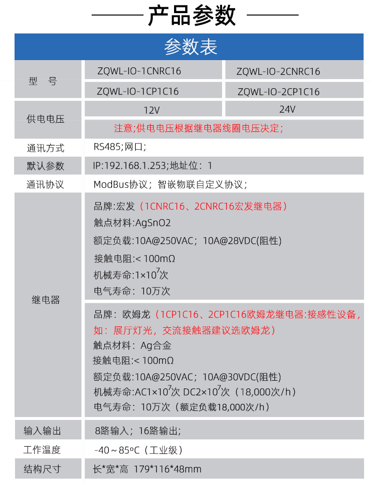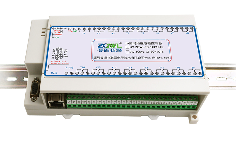 智嵌物联/ZQWL出品的 16 路网络继电器设备,是一款 16 路 NPN 和 PNP 兼容型光电输入、16路继电器输出的工业级 IO 控制板。控制板具有 1 路以太网口和 1 路 RS485 通讯接口,可以通过 Modbus TCP/RTU 或自定义协议实现对该控制板的控制,也可以通过本公司开发的上位机控制软件控制。本控制板具有串口服务器功能(网络和 RS485 数据互相转换)。