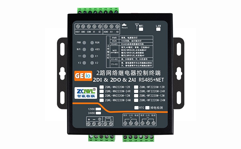 深耕工业控制领域,为满足客户各种工业控制需求,特推出了 GE IO 系列产品。GE IO 系列产品均可选配内置 RTC 时钟,可实现脱机定时控制,再也不用担心因网络不稳定而造成的误控。GE IO 系列均支持 JSON、ASCII、标准ModBus、自定义格式等多种控制指令格式,用户可选用适合自己的控制协议,让控制指令不再单一。GE IO 系列支持设备的级联扩展,用户可根据不同的项目需求任意组合不同功能型号的产品。GE IO 系列按通信方式不同,分为 RJ45 网口版本(WN)和 WiFi 版本(WF)两个子系列型号,用户可根据需要选择合适的型号,本文档主要介绍网络版本的 GE IO 系列的主要使用方法。GE IO 系列,外围接口丰富:16 路继电器输出(DO)、16 路数字量输入(DI)、2 路PT100 检测、8 路模拟量输入测量(AI)、1 路 RS485、1 路网口/Wifi 等。外围接口、业务逻辑可根据用户需求进行定制。